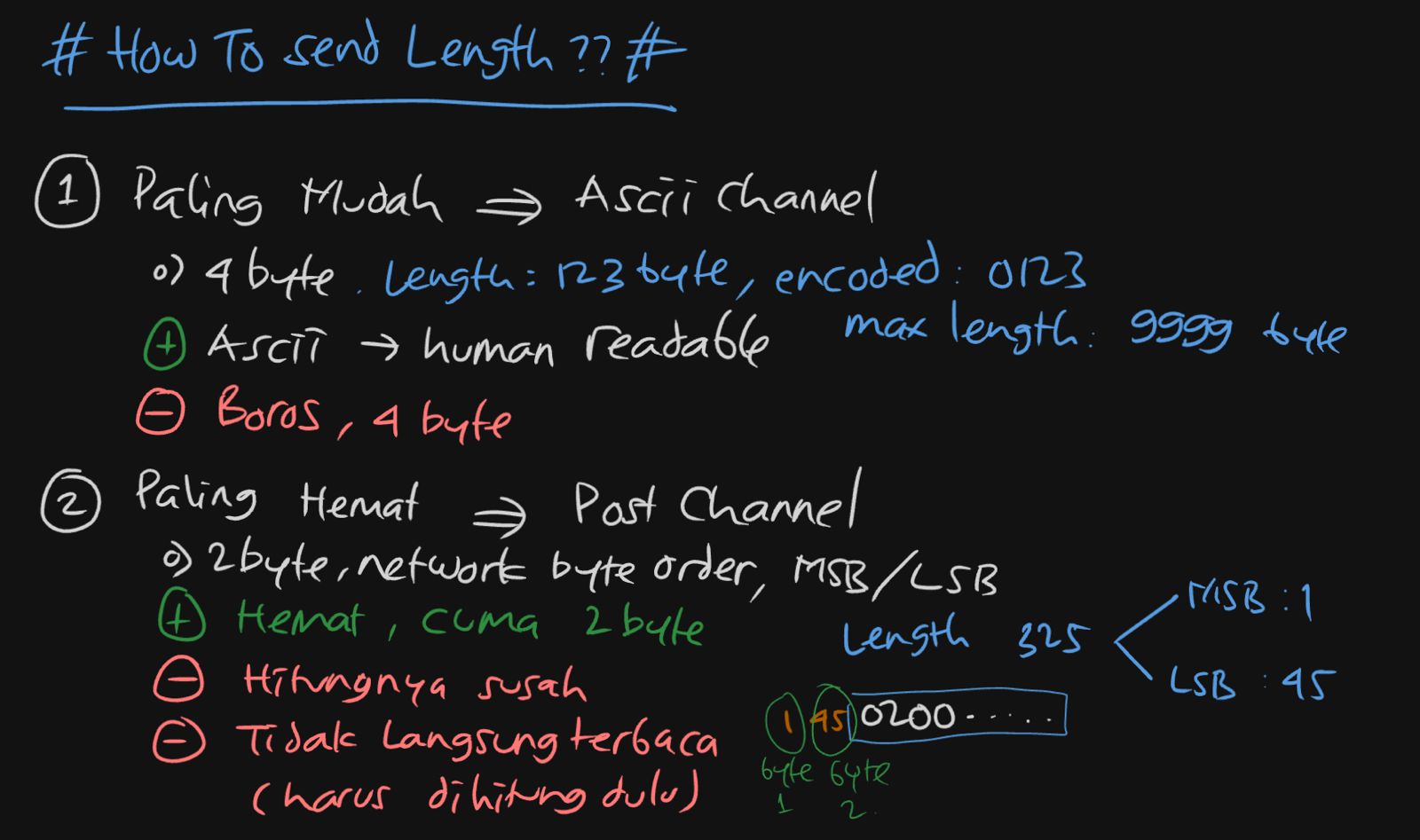 Cara yang lebih efisien adalah mengirim length dalam bentuk binary 2 byte dengan format MSB/LSB (Most Significant Byte / Least Significant Byte), juga dikenal sebagai network byte order atau big-endian.